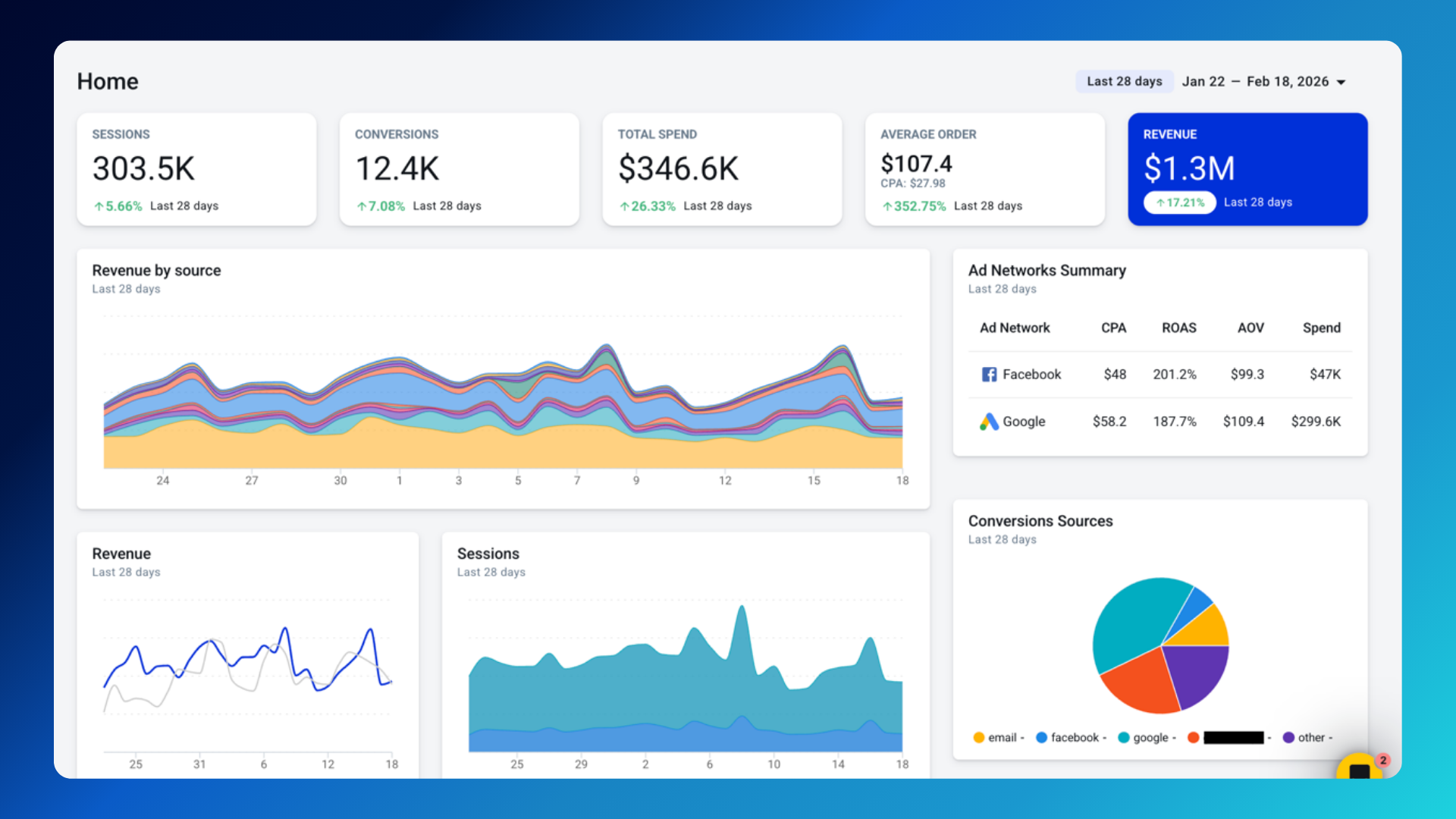 Monitor key metrics on the AnyTrack Dashboard: total sessions, engagements, conversions, and revenue. Compare performance across time periods. View conversion and engagement sources to optimize your marketing strategy.