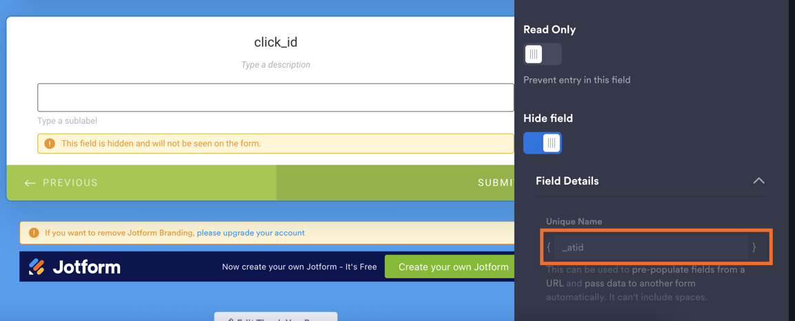 For example, in Jotform you create a custom field and you should manually set the query parameter in the field. If the unique name is in the page URL, it will be picked up by Jotform.